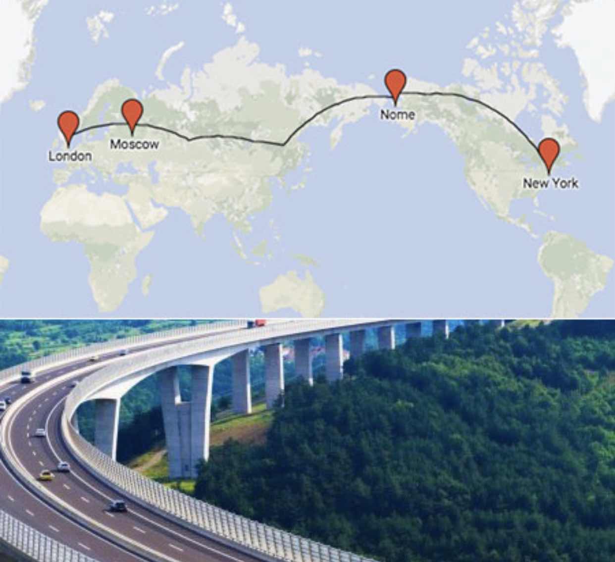 A man named Vladimir Yakunin who is the head of Russian Railways presented a plan to create the ultimate road trip highway, by proposing a superhighway that allows transport from Nome, Alaska to Russia, through the Bering Strait, and on to Moscow and London.